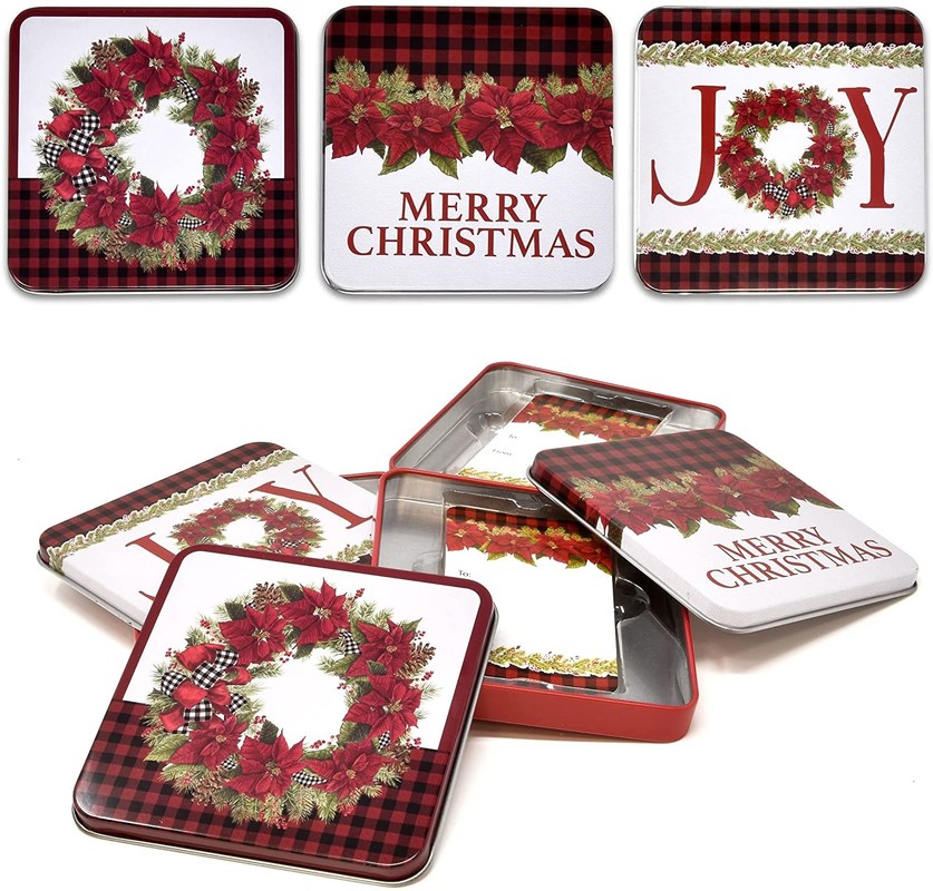 Qualité supérieure : Ces bidons de porte-cartes de chèque-cadeau de Noël sont faits d'étain de haute qualité pour la longévité supplémentaire. Nos boîtes imprimées avec des modèles de Noël sont très utilisées pour tenir des chèques-cadeau de Noël envoyant à d'autres à la fête de Noël, rassemblement de famille de Noël, ou elles peuvent tenir de petits articles, tels que des écouteurs, des cartes, cartes de crédit et plus !